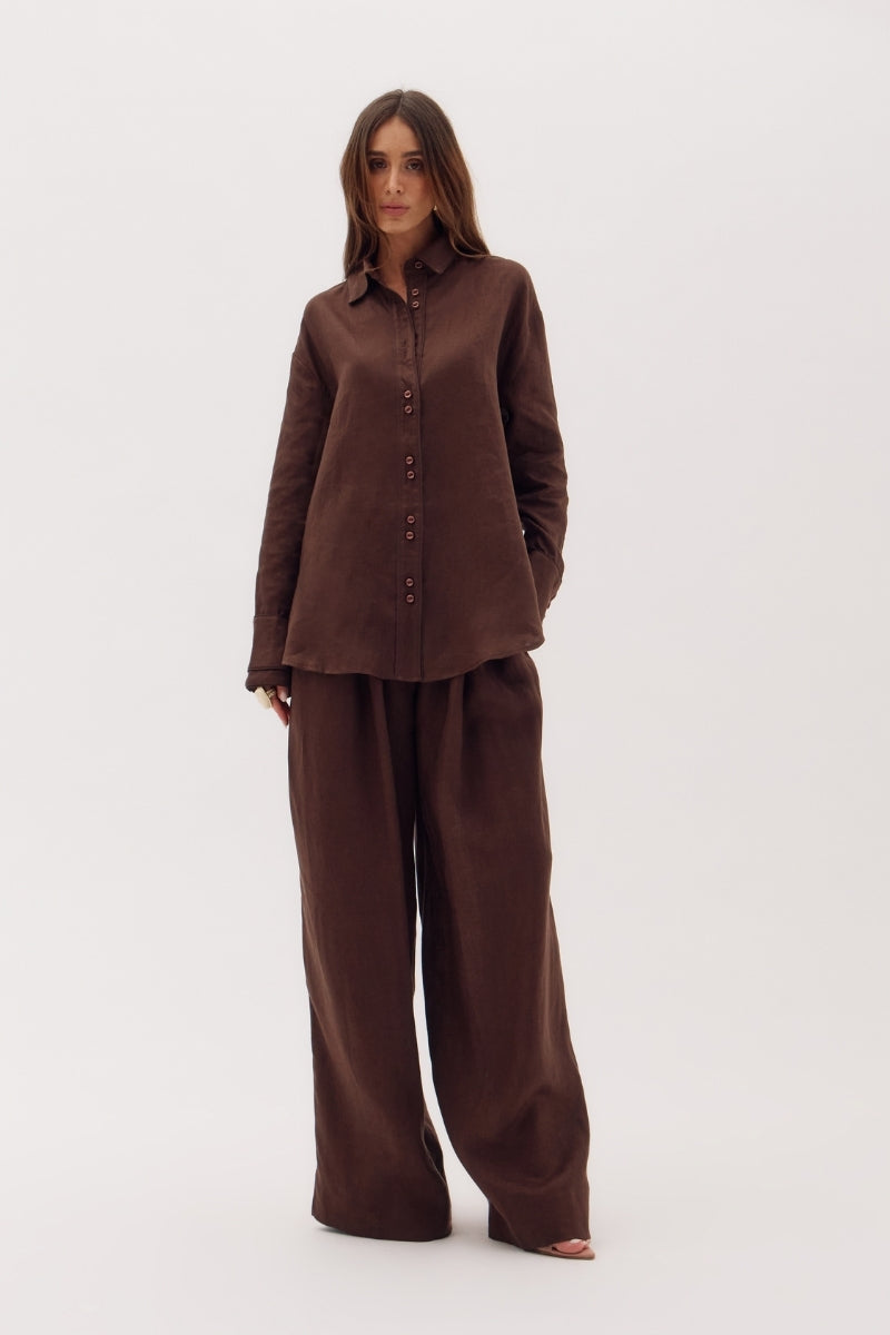 Rendered in a rich dark brown, this luxury linen shirt transitions seamlessly from beach to city, day to evening. Wear it open over swimwear for a laid-back resort look, or buttoned and styled with tailored linen pants or denim for understated sophistication.