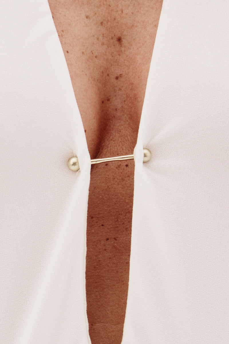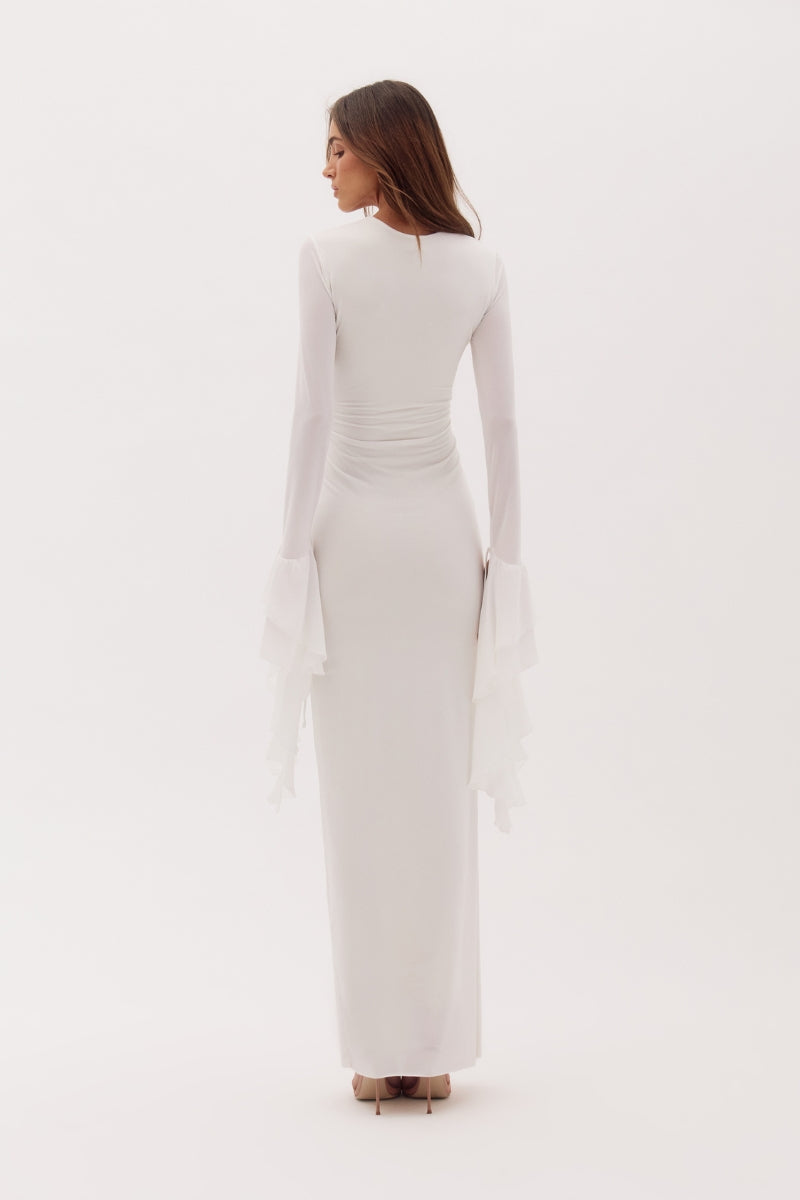 The Simara Flowing Cutout Maxi Dress exudes the elegance and fluidity of High Summer. With its sophisticated design and impeccable drape, it embodies the lightness and modernity of the our DNA, ideal for unforgettable moments by the sea or at special events.   Features: Deep V-neck front with detail, long length, long sleeves with flowing cutouts and slits, fitted silhouette that opens into a mermaid style. Color: Italian Beige Fabric: Body 93% Polyester 7% Elastane, Trims 100% Viscose, Lining 91% Modal 9% Elastane Design: A silhouette-hugging design, a skirt with a discreet front slit, and long sleeves with flowing cutouts that create movement. Details: Metal pin at the V-neck, lightweight, sheer fabric cutouts at the sleeve ends, skirt slit for ease of movement.   TIPS FROM TEAM! For a stunning look, pair the Simara Dress with strappy sandals and gold jewelry. It's perfect for romantic dinners, seaside cocktails, or daytime weddings, guaranteeing an elegant and flowing presence.